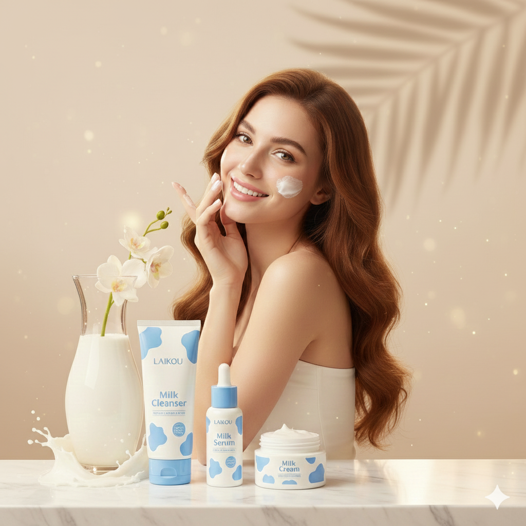 The Veluxx Milk Softening Ritual is a three-step routine powered by milk extract, lactic acid, niacinamide, shea butter, and hyaluronic acid, created to refine rough texture, replenish hydration, and restore a healthy, luminous surface.