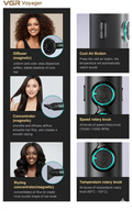 An intelligent LED display provides clear, real-time feedback on settings, while the cool shot button locks styles in place with a professional finish. The magnetic attachments — concentrators and diffuser — ensure fast, secure changes and enhanced styling versatility.